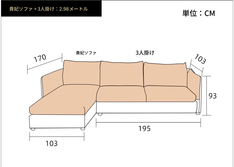 豪華版【接触面真皮】三人用+貴妃用305CM