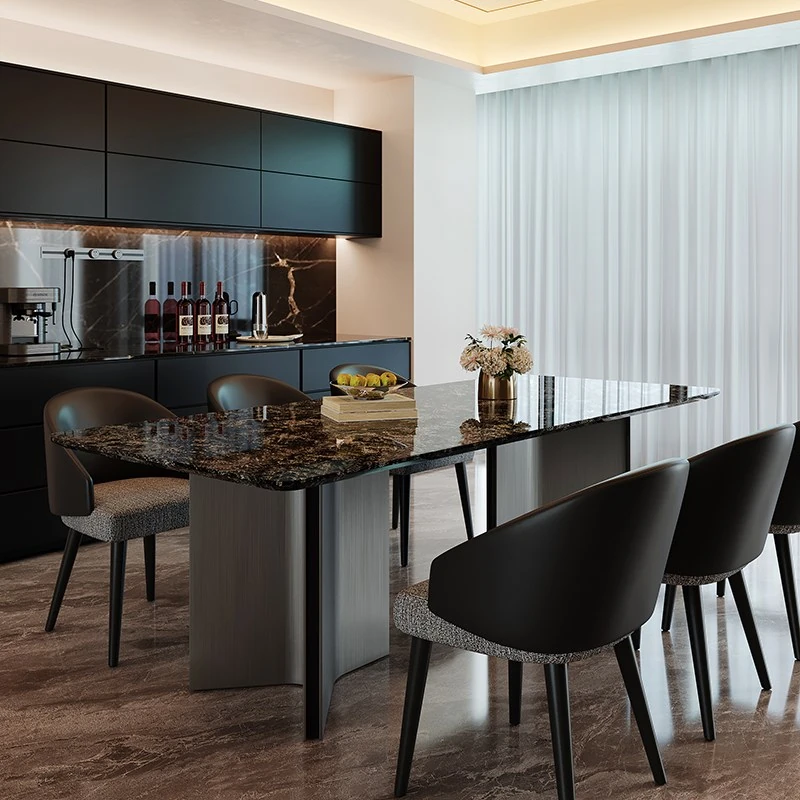 2.0メートル輸入天然プラチナダイヤモンド高級石製ダイニングテーブル+本革ダイニングチェア6脚