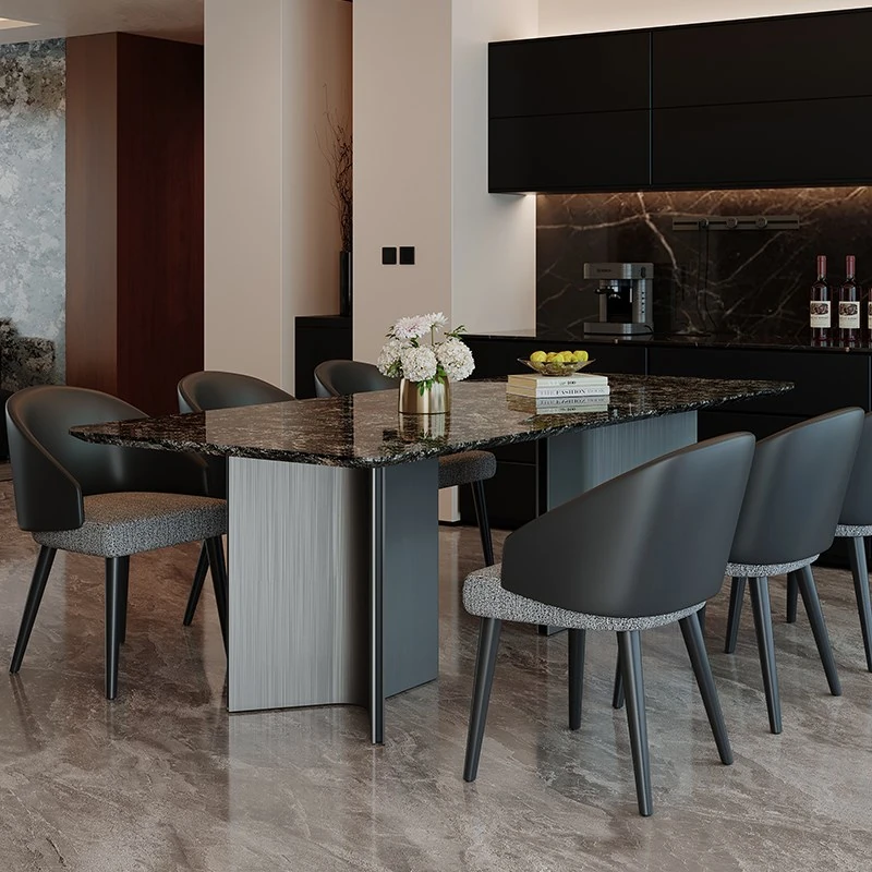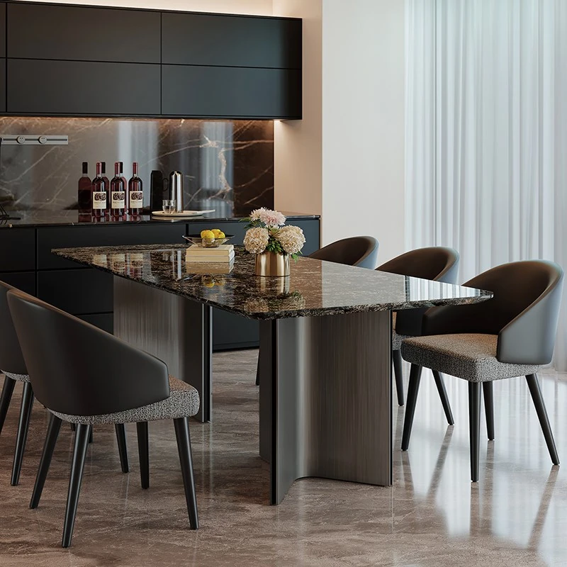 2.0メートル輸入天然プラチナダイヤモンド高級石製ダイニングテーブル+本革ダイニングチェア4脚