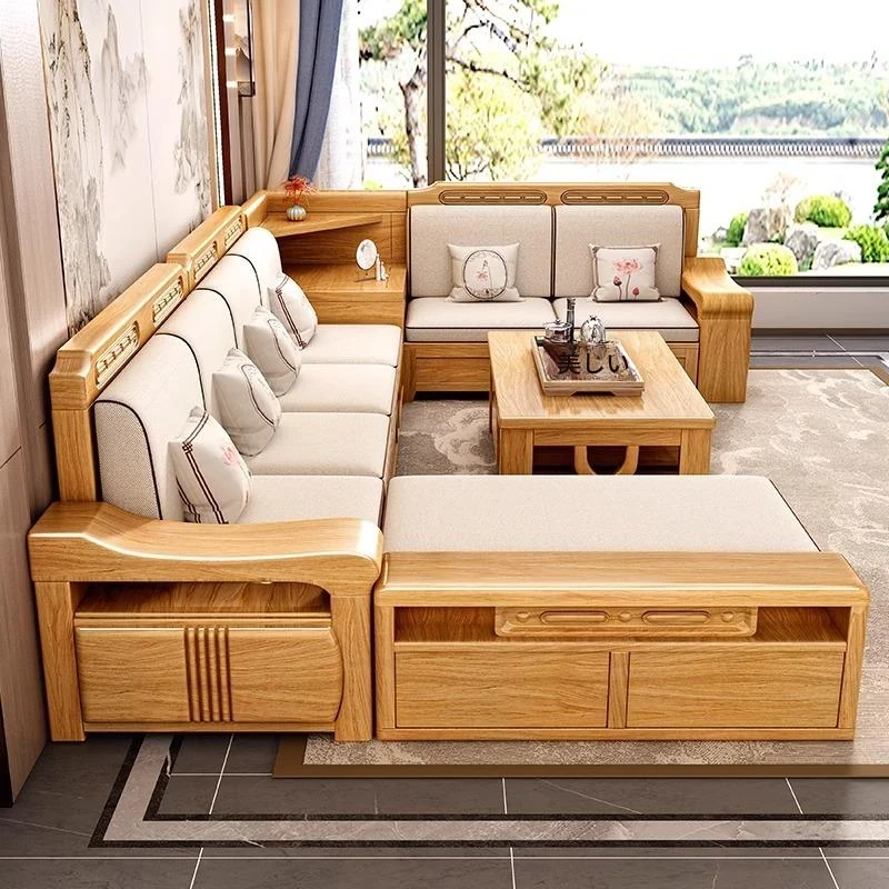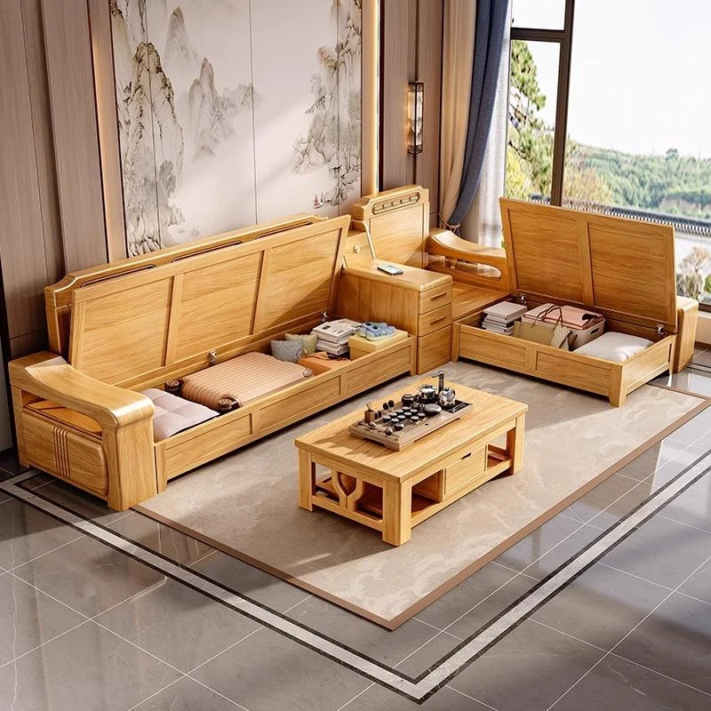 全実木製モダン中式リビング用ソファ|冬夏兼用・小型スペースにも最適なコーナー収納付きナチュラルウッドソファ