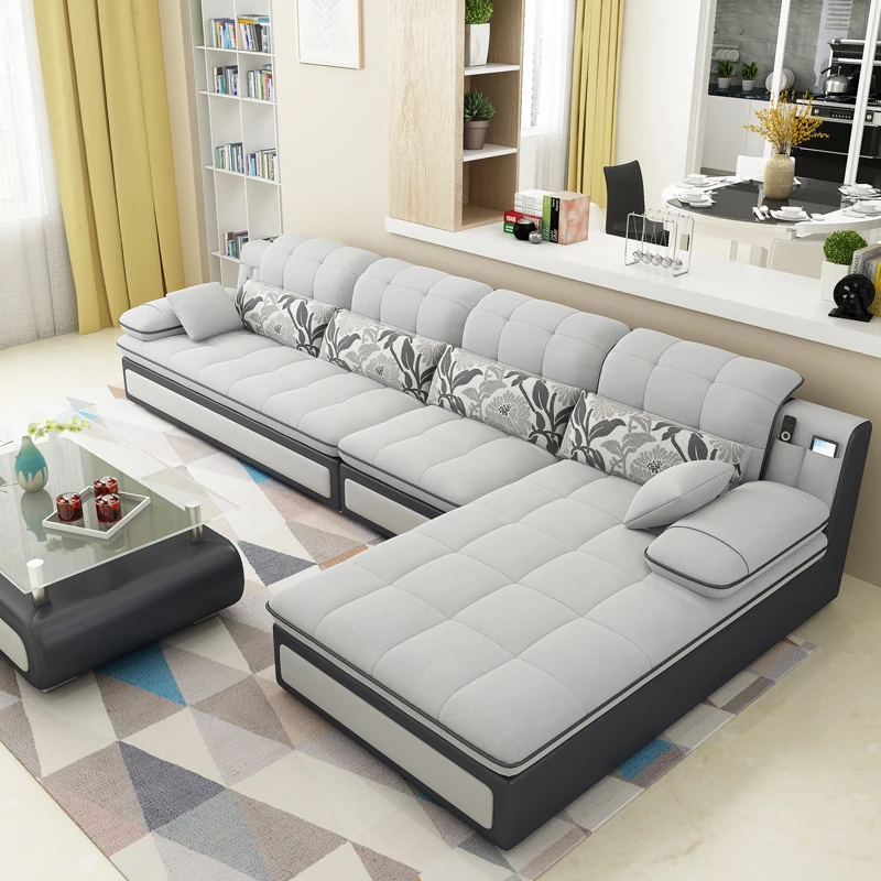 現代的シンプルなデザインのファブリックとレザーのラテックスソファ、リビングにぴったりなL字型の貴妃ソファ、サイズは3m、3.6m、4.2mから選べる!小さな部屋にもフィットするスタイリッシュな選択肢。