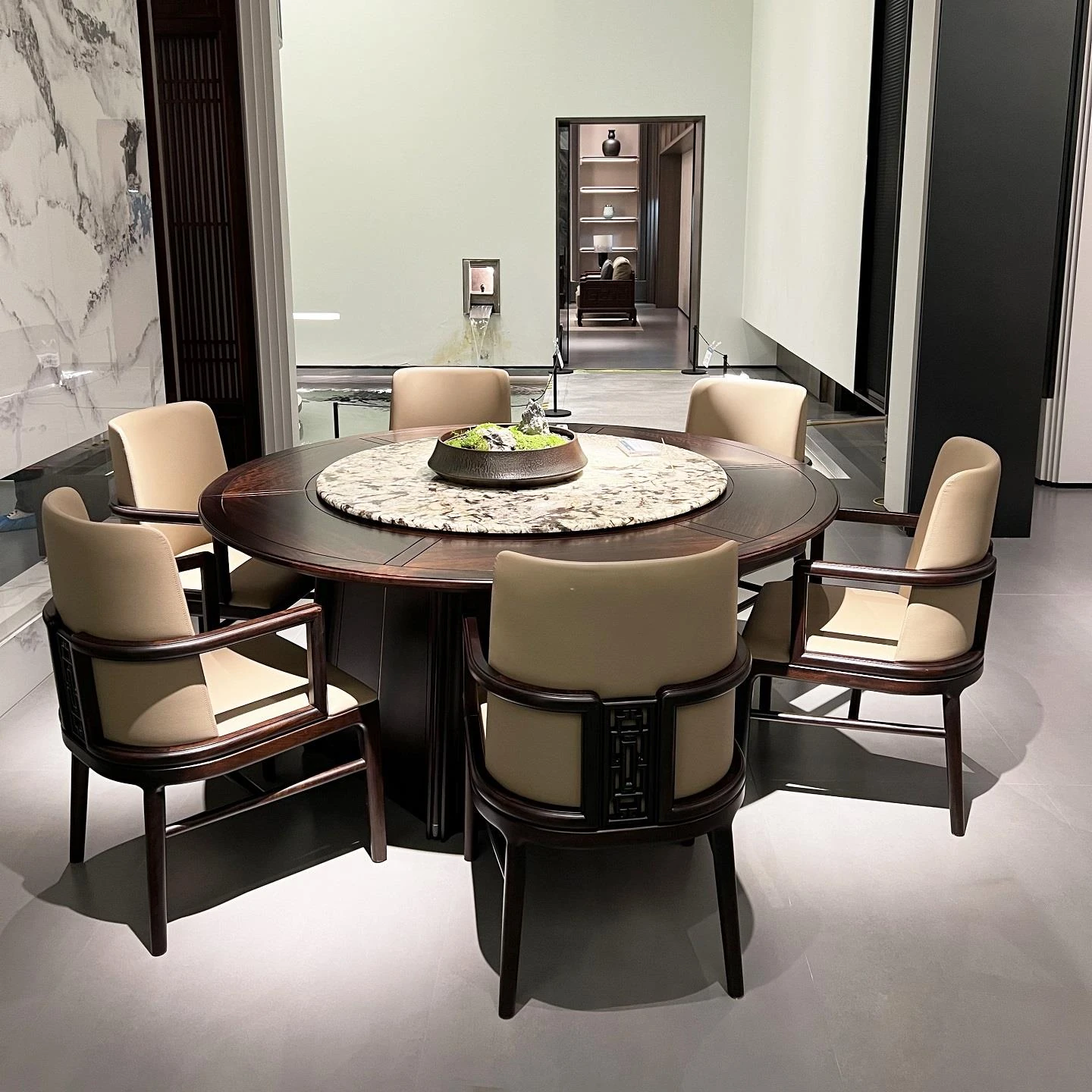 新中式スタイルの天然木製ダイニングテーブル&チェアセット - ウッディな魅力、全実木のラウンドテーブルは大小様々な家に最適!回転式デザインで便利さも追求。