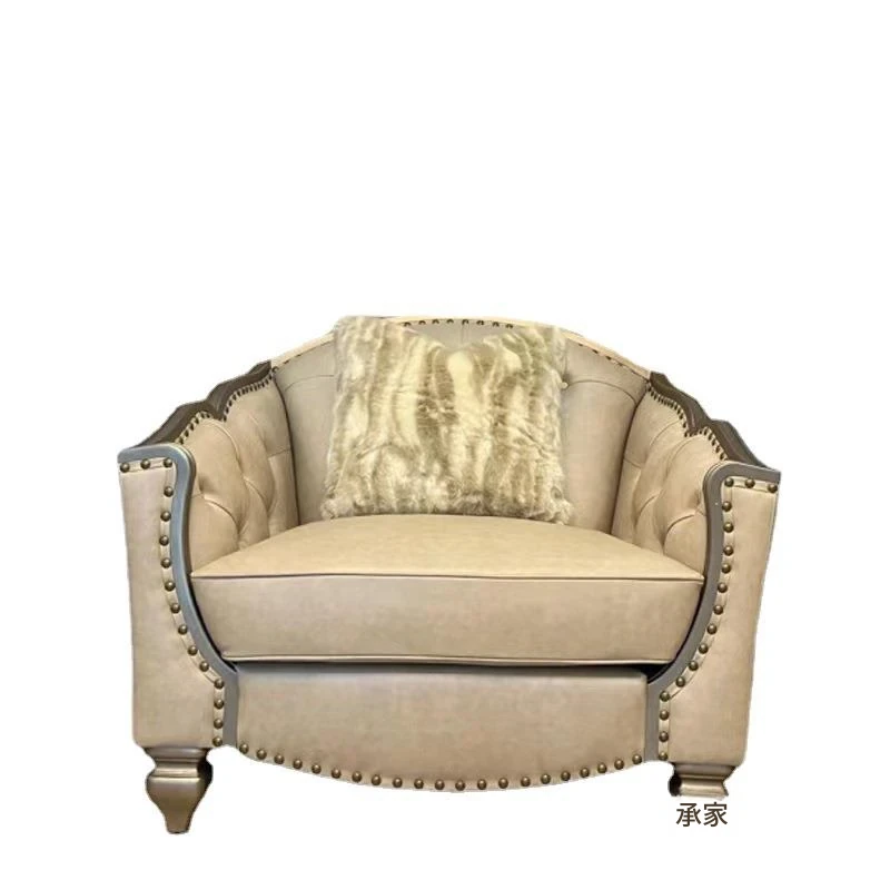 アメリカンスタイルの無垢木製ソファ - ART筑源別荘客リビングにぴったりな現代的な軽奢華フレンチヴィンテージ彫刻デザインの3人掛けレザーソファ。高級感溢れるリラックスタイムをお楽しみください!