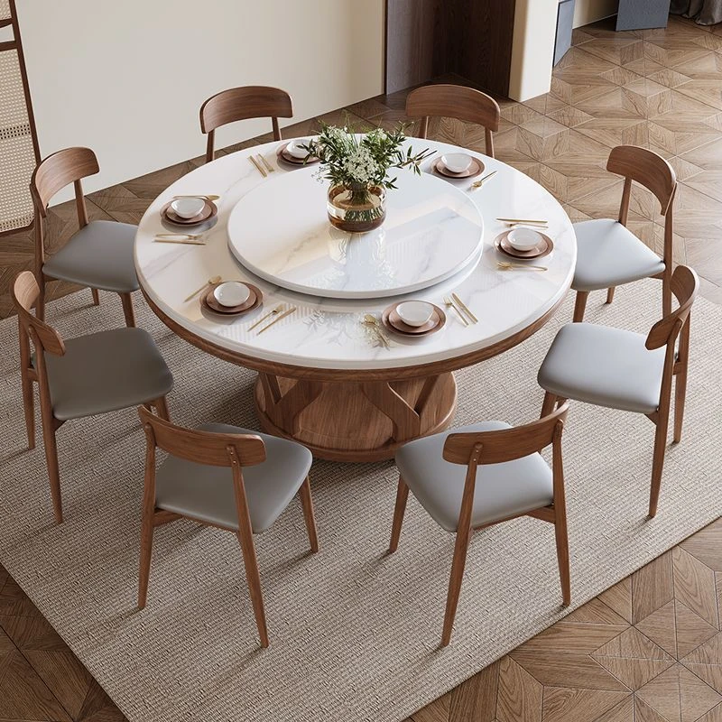 北欧スタイルの全木製ラウンドダイニングテーブルセット - モダンでシンプルな大理石調、回転式プレート付きで家族や友人との食事を楽しく演出!