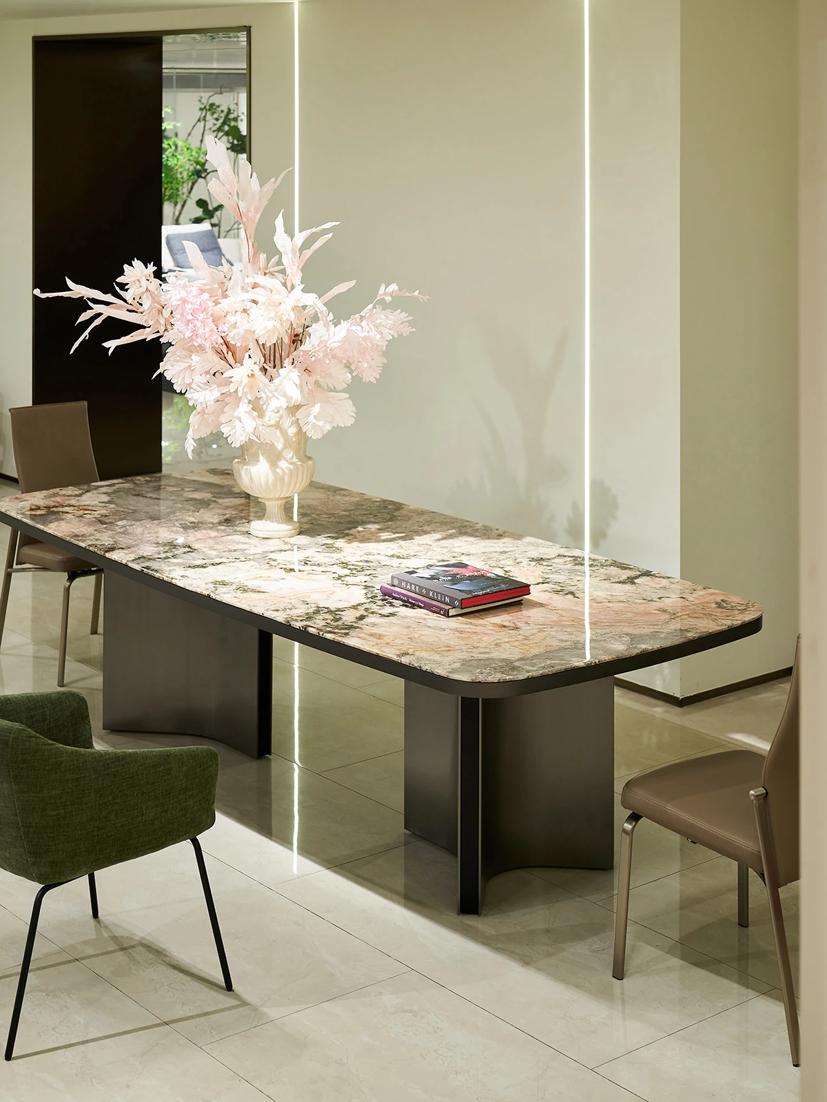 リアス エレガント大理石長方形ダイニングテーブル - イタリアンミニマリズムの美しさを追求した天然素材使用、洗練された軽やかさを演出。あなたの食卓を特別な空間に変える一品!